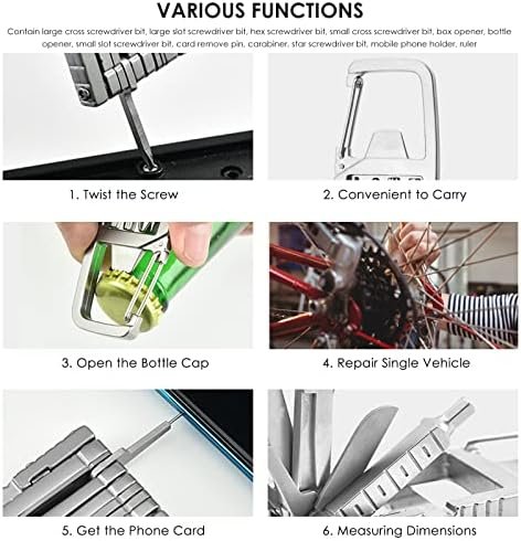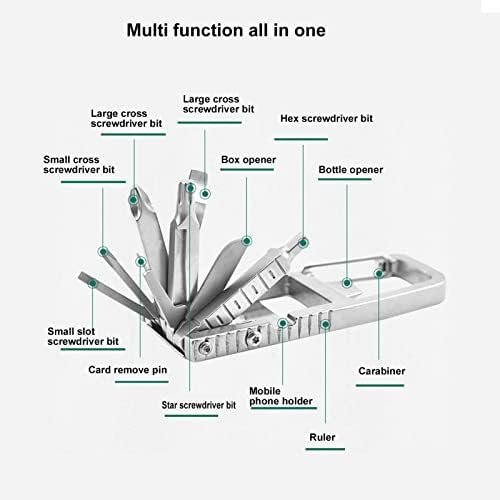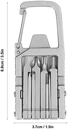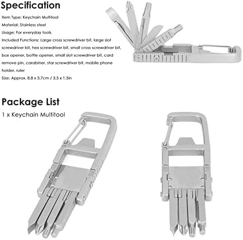 Item Type: Keychain MultitoolMaterial: Stainless steelUsage: For everyday toolsIncluded Functions: Large cross screwdriver bit, large slot screwdriver bit, hex screwdriver bit, small cross screwdriver bit, box opener, bottle opener, small slot screwdriver bit, card remove pin, carabiner, star screwdriver bit, mobile phone holder, rulerSize: Approx. 8.8 x 3.7cm / 3.5 x 1.5in