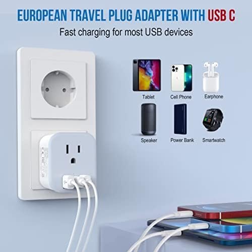 【4-IN-1 EU POWER ADAPTER】 LANUEE european travel plug adapter accepts the standard N American 2 or 3 prong flat pin plug max capacity up to 2500 watt (max 250 Volt, 10 A); Dual USB A port can charge up to 2.4A, single USB C port can charge up to 3A. Using advanced smart chips, it can charge 4 devices at the same time to achieve intelligent optimized charging. Perfect for mobile phones, laptops, cameras, power banks, and more