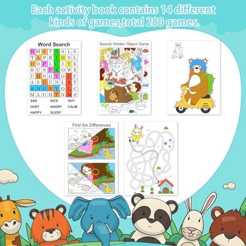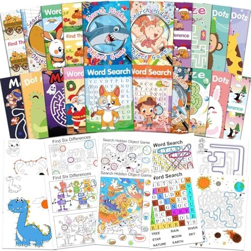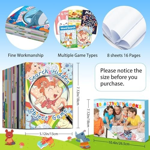 20 Pack Small Activity Books: Our package including 5 different games and each game with 4 books, 20 in total in a box. Game contain Word Search, Maze, Find the Difference, Dot to Dot and Search Hidden Object. Each book with 8 pages and printed on double sides, total of 280 different games available for you.