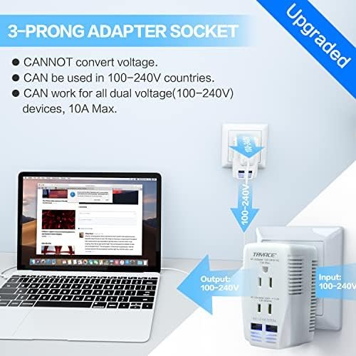10A Adapter for All Dual Voltage Devices: 3-prong AC adapter socket can’t convert voltage, can work with dual voltage (100-240V) devices in every country, such as cell phone, camera, iPad, laptop, Dual voltage hair tools (hair dryer, straightener, flat iron, curling iron, hair Clipper, electric shaver), Dual voltage (CPAP, electric toothbrush) and other Dual voltage devices.