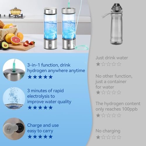 – Astonishing Quality Hydrogen Water Bottle: This Hydrogen Water Bottle, 3 IN 1 Hydrogen Water Bottle Generator, is a portable device designed to produce high-concentration hydrogen water, reaching up to 2500 PPB (parts per billion) through advanced SPE/PEM (Solid Polymer Electrolysis/Proton Exchange Membrane) technology. This technology ensures high purity and stability of the hydrogen produced.