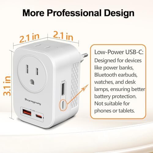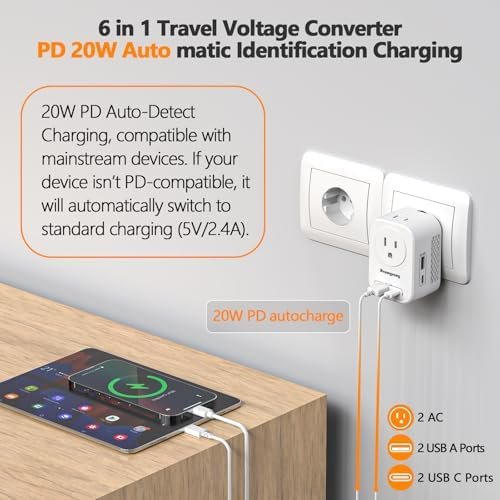 All-New Upgraded Travel Charging Technology: The Shayangyoung Voltage Converter uses proprietary patented technology with a PD20W automatic charging protocol. If your electronic device supports PD charging, our converter will automatically recognize it and provide PD charging. If your device does not support PD charging, it will automatically switch to standard charging (5V/2.4A). The orange port with the lightning bolt symbol on the front is the PD charging port.