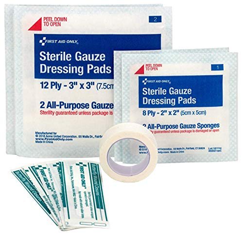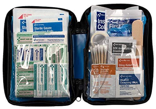 Adhesive Plastic Bandage, 1″ x 3″: 20 Adhesive Plastic Bandage, 3/4″ x 3″: 25 Adhesive Plastic Bandages, 3/8″ x 1 1/2″: 20 Alcohol Wipes: 12 Antibiotic Ointment Packets, 0. 9g: 2 Butterfly Wound Closures: 5 BZK Antiseptic Towelettes: 6 Cold Pack, 4” x 5”: 1 Cotton Tipped Applicators: 10 Finger Splint/Tongue Depressor: 5 Fingertip Fabric Bandage: 2 First Aid Guide: 1 First Aid Tape, ½” x 5yd: 1 Knuckle Fabric Bandage: 2 Nitrile Exam Gloves: 2 Sterile Gauze Pads, 2”x 2”: 4 Sterile Gauze Pads, 3” x 3”: 4 Sting Relief Wipes: 3