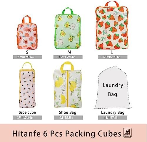 Packing Cubes 6 Piece Set: 3 X different size compression packing cubes travel; 1 X makeup bag(tube cube), 1 X travel shoe bag , 1 X drawstring laundry bag . Every seasoned traveler knows that easy access and organization are key, and with these compression travel cubes, packing is a breeze! They save 100% of luggage/bag space, help you categorize your items, and prevent them from getting lost. This also makes airport security checks quick and convenient.