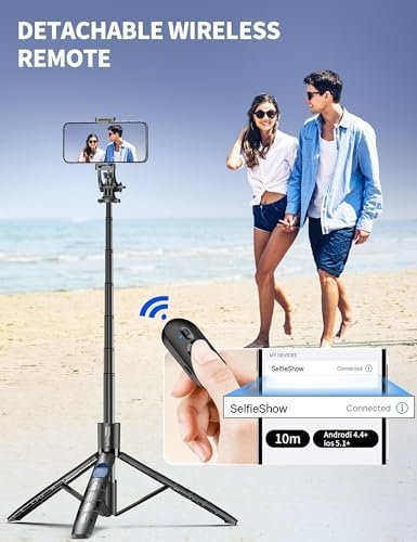 ✅【Unlimited 360° Rotation & Detachable Remote】: SelfieShow tripod for iphone can be rotated 360°, support top down, back up, horizontal and vertical screen rotation, free photo angle to meet your daily shooting needs. The portable tripod selfie stick comes with a remote that compatible with iOS and Android. Supports a maximum shooting distance of 33 feet. The remote trigger is conveniently embedded in the selfie stick tripod’s leg, ensuring that it won’t get lost.