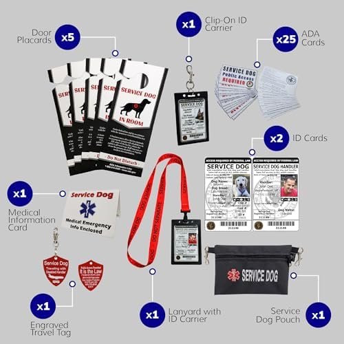 All In One Service Dog Travel Accessories – Includes (5) Service dog door placards; (1) Medical information card; (25) Federal ADA service dog cards; (2) Registered service dog and handler ID cards; (1) Engraved service dog tag for travel; (1) Service dog pouch, and a Do Not Separate lanyard with ID carrier, covering all your travel needs