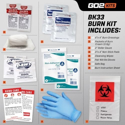 CONTAINS ALL THE ESSENTIALS – Each emergency kit contains 2 4”x4” burn dressings, 2 burn cream packets (0.9g), 1 2” gauze roll, 1 disposal bag, 2 3”x4” non-stick pads, 1 burn instruction sheet, 2 cleansing wipes, and 1 pair of nitrile gloves.