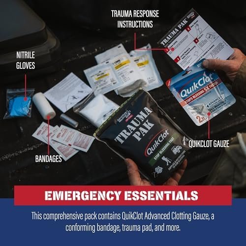 Includes QuikClot gauze, trauma pad, triangular bandage, and other key supplies for your trauma kit