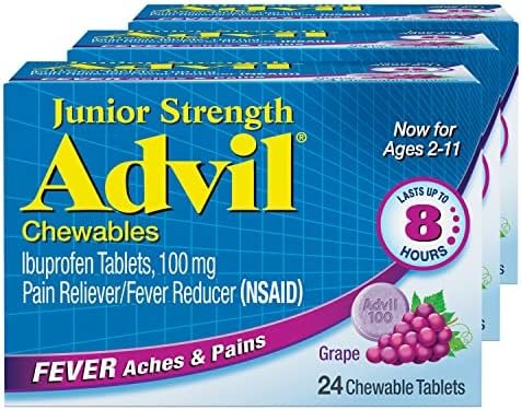 Three pack of 24 grape-flavored tablets of Advil Junior Strength Pain Reliever and Fever Reducer, Chewable Children’s Ibuprofen for Pain Relief