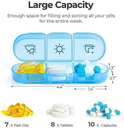 Perfect for Carrying: This weekly pill box organizer has 7 separate daily pills organizer for a week, a total of 21 large compartments. Daily you can take 1 day pill container that is small enough to stash even in your pocket or purse. When you go travel, just crab this vitamin planner bag to go.