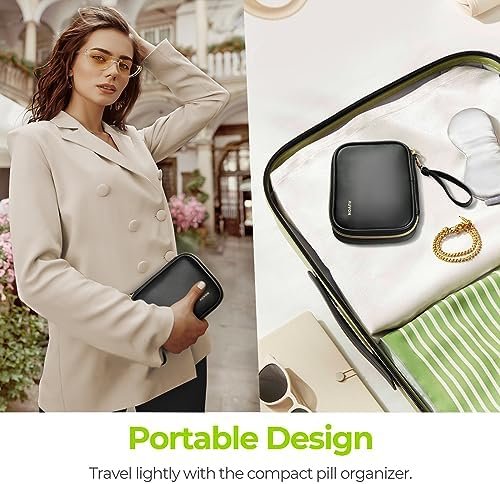 Fashion Pill Organizer: This weekly pill box comes with a fashionable black PU leather bag that features a durable gold zipper, does not fade, has no peculiar smell, and is durable. It helps your pill prevent spillage and also can protect your privacy.