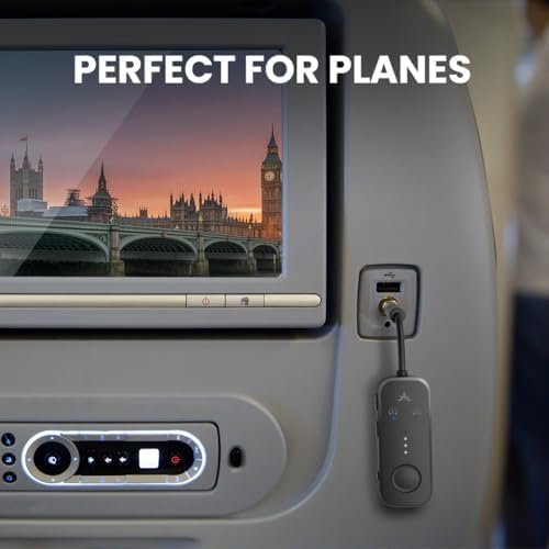 [WIDE COMPATIBILITY] The included dual 3.5mm adapter makes the Relay usable on any plane, no matter what audio output jack it uses. It also works with any device that outputs audio via AUX, such as a tablet, PC, gym equipment, etc., and can connect to any and all Bluetooth headphones or earbuds (such as AirPods Pro 2).