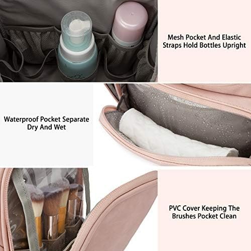 Keep Organized: Five elastic straps and four mesh pockets in main compartment to keep the bottles stand upright, avoiding liquid leakage, the waterproof front pocket separates the wet item, recommends storing the wet towel