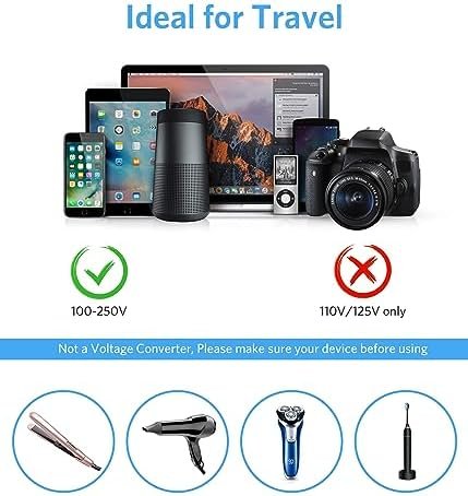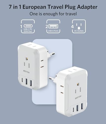 European Travel Plug Adapter USB C: The dual USB-A ports can charge devices at up to 2.4A each, while the USB-C PD 20W fast charging port offers double the speed compared to other adapters. This makes it perfect for charging cell phones, tablets, laptops, earphones, and more.