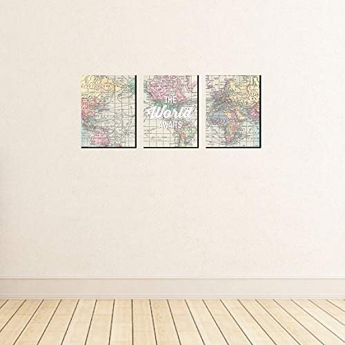 PREMIUM HOME DECOR: 3-piece World Awaits Wall Art Set is professionally printed on thick material with a black edge. You will not need to frame this set of travel map room decor. Each standout print is ready to hang and will add a contemporary touch to any room.