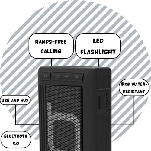 LITTLE SPEAKER THAT PACKS A PUNCH – IPX6 Water resistant speaker with a LED Super Bright Flashlight, aux in, USB player, MP3 Player TF Card Player Slot, FM Radio & Bluetooth