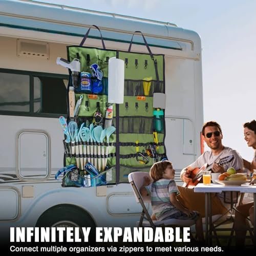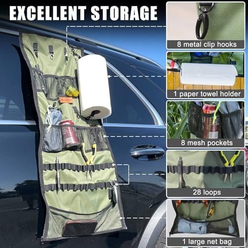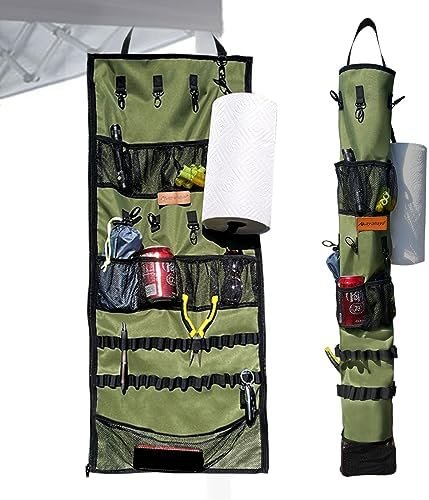Versatile Storage Solutions: The camping organizer offers a range of storage options, including built-in net pockets, cup holders, hanging hooks, a campsite storage strap, and a paper towel holder. This allows you to conveniently store keys, utensils, tools, backpacks, cellphones, and other essentials.