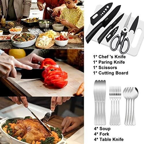✅ What will you Get- Our Camping Cooking Utensils set It allows you to have a mini kitchen anywhere:1*Storage bag, 1*Soup Ladle, 1*Slotted Turner, 1*Barbecue Fork, 1*Fish scale planer, 4*Soup, 4*Table knife, 4*Fork, 2*Extendable BBQ forks, 2*Barbecue Skewers,1*brush, 1*Paring knife,1*Chef’s knife, 1*Three in one planer, 1*Scissors, 1*Cutting board, 1*Can opener, 1*Wine opener, 1*Slotted Tongs, 1*Knife sharpener, 1*Stainless Steel Tea Ball, 1*Gloves, 1*dish towel,1*Castor. Total of 35 pieces.