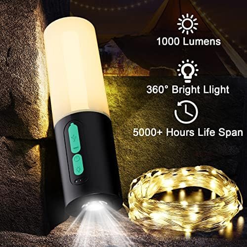 4 𝑰𝑵1 𝑪𝒂𝒎𝒑𝒊𝒏𝒈 𝑺𝒕𝒓𝒊𝒏𝒈 𝑳𝒊𝒈𝒉𝒕 𝒂𝒏𝒅 𝑪𝒂𝒎𝒑𝒊𝒏𝒈 𝑳𝒂𝒏𝒕𝒆𝒓𝒏 – These camping lanterns last a long time, the emergency camping lantern works 10-20H after a full charge, and the camping string lights work 10-20H.The innovative COB lamp technology provides tremendous brightness of up to 1000 lumens and presents soft, uniform light of 360°, illuminating large areas. Our camping lights are essential for darkness, power outages, and emergency preparedness.
