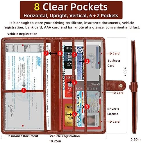 Pocket features: 1 + 1 on the left/2 + 3 + 1 on the right, 8 transparent pockets with flat duplex design and clear compartments; 1 large pocket on the left and right for car registration and insurance documents, 5 small pockets for driver’s license, ID card, AAA card, business card, receipt, key contact information card and 1 medium pocket for other information.