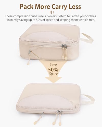 【SAVE 50% OF SPACE】Our Packing Cubes come equipped with an efficient ZIP compression system, saving you both SPACE and TIME when packing. The high compression rate allows 1 suitcase to fulfill the role of 2, and its high efficiency enables you to focus more on your journey.