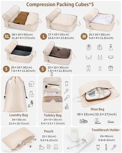【Compression Packing Organizers 10 Set】Compression Packing Cubes * 5, Laundry Bag * 1, Shoe Bag * 1, Toiletry Bag * 1, Waterproof Pouch * 1, Travel Toothbrush Holder * 1