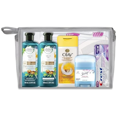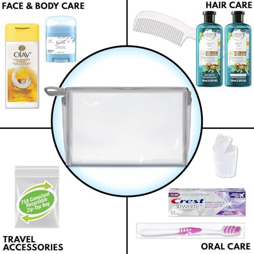 Kit Contains 10 PC’s: Hair Care: Herbal Essence Shampoo w/Argan Oil 3.38 oz., Herbal Essence Conditioner w/Argan Oil 3.38 oz., White Styling Comb, Body Care: Body Wash 3 oz., Secret Deodorant Powder Fresh .5 oz., Oral Care: Crest Brilliance Toothpaste .85 oz., Adult Toothbrush, Toothbrush Cover, Other Essentials: TSA Approved Quart Size Zip Top Bag in Clear Front and Back Rectangular Bag with Silver Print