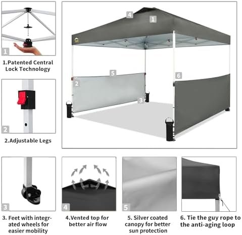 [EASIEST SET UP]: Patented one push center lock technology – central hub locks out all four legs with a single push. Then use the soft pinch-free buttons to set the leg height. Next generation canopy designed so two people can set it up in seconds with no tools necessary.