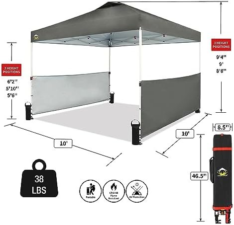 [LARGE SPACE]: 10′ x 10′ canopy footprint with 100 square feet of shade. Over 9’4” maximum interior height, and over 6′ maximum clearance under the valance. Plenty of standing room, and 10 people can sit comfortably in the cool shade.