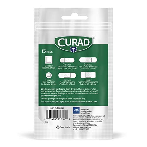 The CURAD First Aid Portable Pack, 15 count offers the first aid essentials. Great for on-the-go wound care, this Portable Pack contains everything to keep you covered when you need it most. It contains multiple sizes and types of bandages, including versatile Flex-Fabric, Waterproof, Plastic and Spot bandages. It also includes alcohol swabs to provide excellent cleansing action.