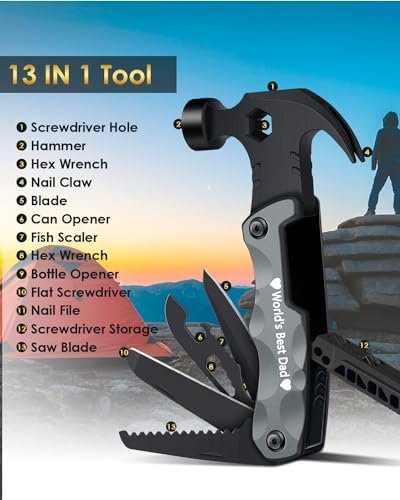 [Portable Emergency Survival Tools]: This multitool hammer is a utility tool for keeping in the car to deal with any emergencies. strong enough to shatter the glass curtain wall, cut the rope curtain in a dangerous escape. Multitool Hammer for camping survival tools also can cut, pry, twist the screw, saw wood, etc. Buyers always said: “It’s a cool gadgets for men”, “really cool tools gifts for men”, “bought for dad gifts, he loves this multitool hammer so much!”, “so cool multi tools”