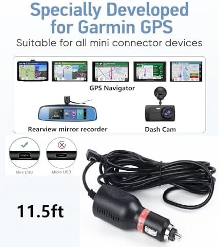 Dash Cam Charger Cable Dash Cam Charger Cable,Mini USB car power cord is compatible with any type of car, truck,,and fits for Dash Cam, GPS navigator, MP3 Player, Digital Camera, Game console, etc.Cable for car dash camera Note : Please be sure to check the length of the power cord before purchasing: 11.5 ft (3.5m). Check the charging interface: Mini USB interface .Input: 9V – 36V. Output: 5V / 2.0A. All delivery 90 degree right corner joint .Mini usb dc 12V-24V car charger adapter power cable for car dash .Dash Cam power cord Cable for car dash camera High quality、High Standards、Multi Function Mini USB car charger,for Garmin car Charger,Garmin dash cam,Garmin gps ,Garmin Nuvi C255 Dash cam.Dash Cam charger Dash Cam charger with built-in current management module eliminates the issues of over voltage, over current, and over temperature.Dash Cam charger Dash Cam charger with built-in current management module eliminates the issues of over voltage, over current, and over temperature.