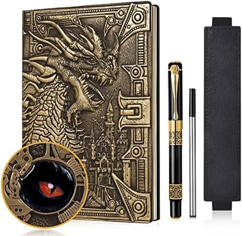 This fantasy leather journal with vintage fancy pen is a perfect gift for DND or DM Player or anybody like the vintage notebook with 3d vision.