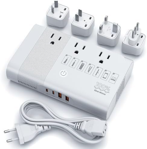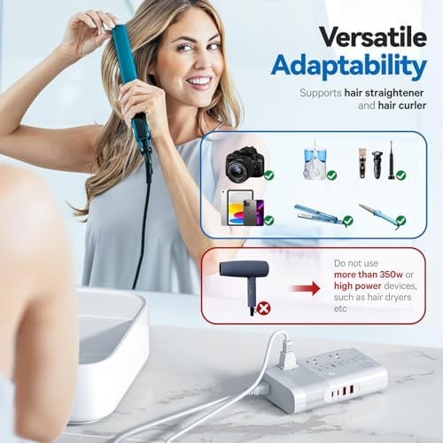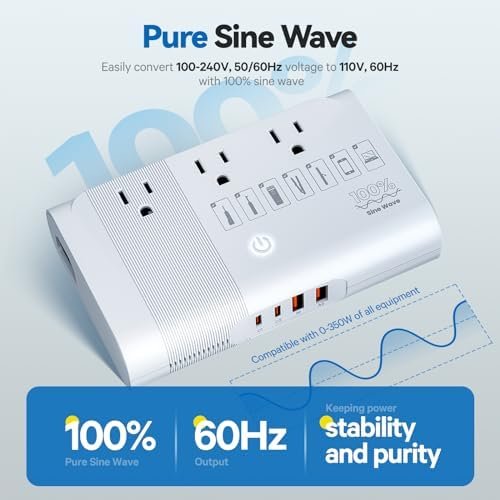 100% Pure Sine Wave 500W Max Voltage Converter: Our 350-watt power converter is equipped with three standard AC outlets, two USB-A ports, and two USB-C ports, allowing you to charge multiple devices at once. It’s compatible with American hair straighteners and curling irons up to 500 watts and supports other electronics under 350 watts, such as hair clippers, electric shavers, toothbrushes, flossers, beard trimmers, laptops, breast pumps, nebulizers, CPAP machines, gaming consoles like Xbox, tablets, TVs, and more.