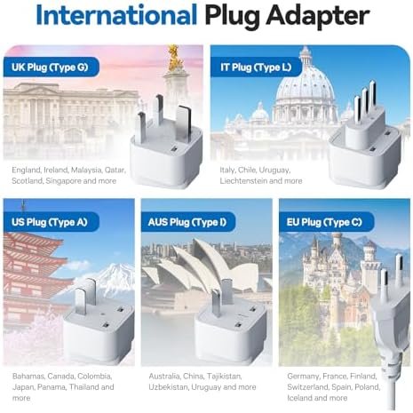 International Travel Adapter Converter Combo: This set comprises 1 EU power cable and 4 international adapters (UK/US/AU/IT plugs), providing global compatibility. Serving as a 220 to 110v voltage converter, it caters to travel from the US to Europe, Israel, the UK, Africa, India, Italy, France, China, Australia, Iceland, and more, making it suitable for use in over 200 countries worldwide.