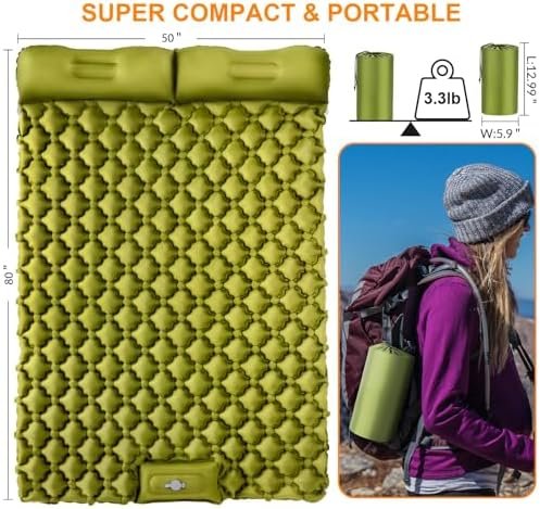 【4.0‘’ Ultra-Thick Double Sleeping Pad for 2 Person】Made with the strongest outdoor-grade material, Our camping pads is perfect for any weather conditions. Be able to accompany you on any type of adventure, our double camping mattress pad inflates to an impressive size of 78″ X 50″ X4” and will give you the comfort you need.The sleeping pad is waterproof and only 3LB weight, making it perfect and super easy to carry for any outdoor activities backpacking sleeping pad