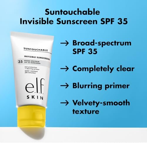 The clear choice in sunscreen is e.l.f. SKIN’s Suntouchable! Invisible SPF 35. This clean, lightweight gel sunscreen delivers invisible broad-spectrum SPF 35 protection and leaves zero white cast on all skin tones. The non-greasy feeling gel formula doubles as a f”The clear choice in sunscreen is e.l.f. SKIN’s Suntouchable Invisible SPF 35. This clean, lightweight gel sunscreen delivers invisible broad-spectrum SPF 35 protection and leaves zero white cast on all skin tones. The non-greasy feeling gel formula doubles as a face primer to smooth your complexion and grip your makeup for long-lasting wear. Plus, the formula is enriched with aloe and meadowfoam seed. Why You’ll Love It: • Invisible sunscreen for your face with broad-spectrum SPF 35 • Zero whitecast in a non-greasy feeling gel formula • Doubles as a blurring face primer to smooth skin and grip makeup for long-lasting wear • Infused with skin-loving ingredients like aloe and meadowfoam seed • Water-resistant • Great for all skin tones Key Ingredients: • Meadowfoam Seed • Aloe Great For: Normal, Dry, Oily, and Combination Skin Types All e.l.f. products are free from phthalates, parabens, nonylphenol ethoxylates, triclosan, triclocarban, and hydroquinone. All e.l.f. SKIN is also free from sulfates. Proud to be 100% vegan, cruelty-free, and Leaping Bunny Certified. Because kindness is chic. All e.l.f. products are proud to be 100% vegan, cruelty-free, and Leaping Bunny Certified. Because kindness is chic.”ace primer to smooth your complexion and grip your makeup for long-lasting wear. Plus, the formula is enriched with aloe and meadowfoam seed.