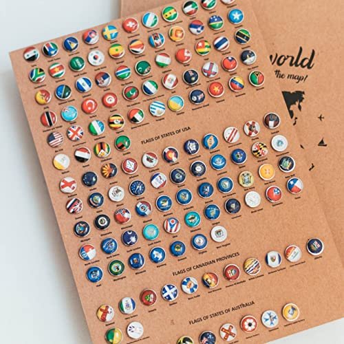 SET: includes a box of 287 flags of all the countries on the Map, provinces of Canada, states of USA, states of Australia and of additional islands. Please notice that some countries’ flags are omitted.