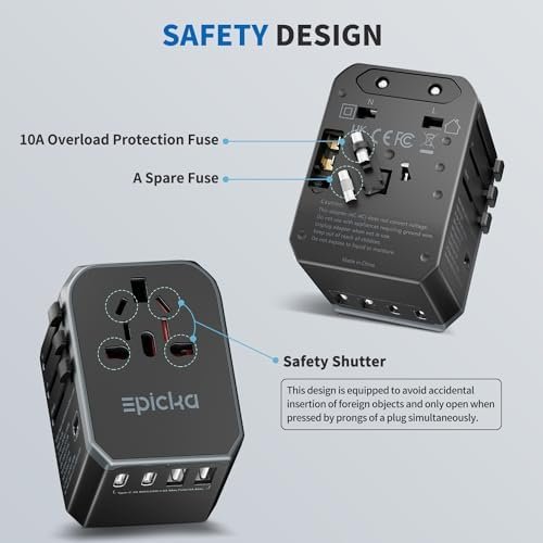 PORTABLE AND SAFE – This compact and lightweight travel essentials is ideal for travelers, overseas business, work, and students. It does not have surge protection and can be conveniently used on a cruise ship as well. Built-in 10A fuse, safety shutters, separate plug lock system, RoHS, CE, and FCC certifications provide extra peace of mind. TIPS: If you need more fuses, you can search for “TA-105C replacement fuse” on Amazon for purchasing. Please ensure that you’re selecting Epicka 10A fuses.