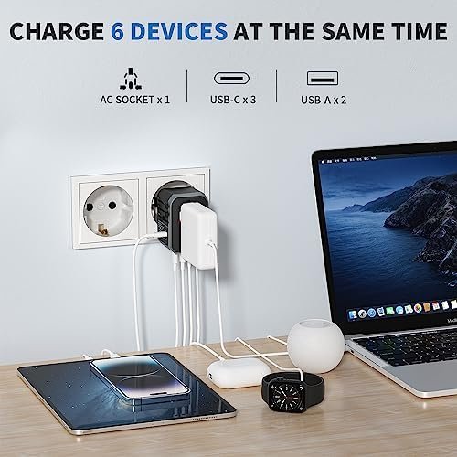 3 USB-C AND 2 USB-A PORTS – Charge multiple USB devices simultaneously at high speed through 3 USB-C port (3A) and 2 USB-A ports (2.4A). Ideal for charging iPhone, Samsung and other Android phones, smart watch and fitness tracker, tablet, power bank, camera, handheld game console, headsets, and everything else that is charged through a USB port.