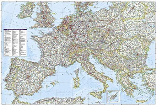 The north side of the printed map includes the northern extents of Europe including Scandinavia, Finland and Iceland. The southern side of the printed map includes the majority of mainland Europe and the countries of the Mediterranean with each country highlighed in its own color. Major roads and ferry routs help you navigate this densely populated continent with thousands of towns from mega-cities such as London and Paris to small towns in the hinterlands of Bulgaria.