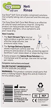 This natural sinus and nasal rinse kit includes 50 saline packets. Syringe delivery system provides maximum control over the pressure and duration of rinse and protects against back-flow if user slows down or stops during rinse. The swirl-stream tip with fluted internal walls produces a gentle swirl for an effective large volume, low pressure nasal rinse.