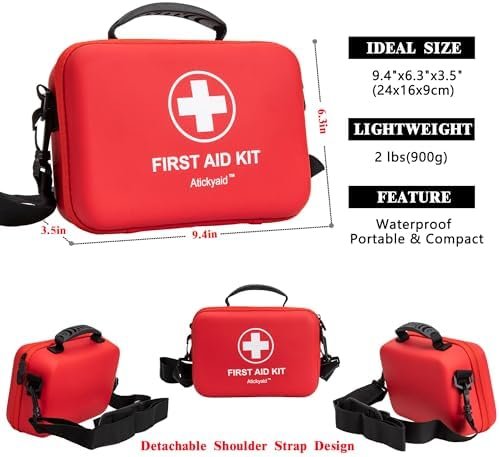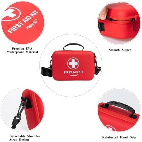 Contains 340 pieces of premium first aid supplies Detachable shoulder strap design Premium EVA waterproof material Suitable size & easy to carry Compact & well-organized Comprehensive – contain a variety of medical supplies such as adhesive bandages, gauze pads, cleaning wipes, and basic medical tools like scissors and tweezers.
