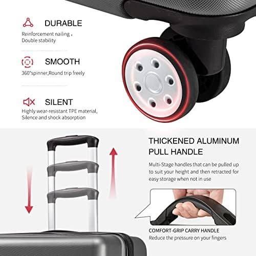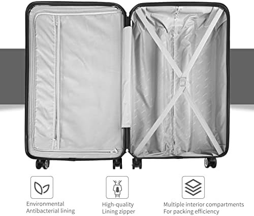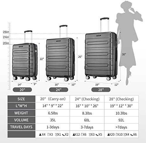 【3 Piece Hard Suitcase Set】: The set includes three pieces that measure 20, 24, and 28 inches.Carry-on cases are compact enough to fit in the overhead bins on domestic and international flights. Another 2 pieces will need to be checked into the hold when you fly.The smaller cases can fit inside the larger one for storage when not in use, just like a Russian stacking doll
