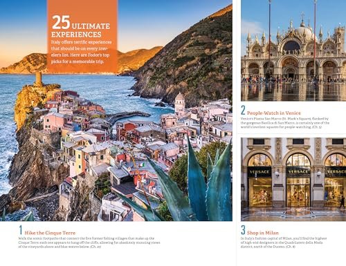 AN ILLUSTRATED ULTIMATE EXPERIENCES GUIDE to the top things to see and doMULTIPLE ITINERARIES to effectively organize your days and maximize your timeMORE THAN 78 DETAILED MAPS and a FREE PULL-OUT MAP to help you navigate confidentlyCOLOR PHOTOS throughout to spark your wanderlust!HONEST RECOMMENDATIONS FROM LOCALS on the best sights, restaurants, hotels, nightlife, shopping, performing arts, activities, and morePHOTO-FILLED “BEST OF” FEATURES on “The Best Ancient Sites in Rome,” “Italy’s Best Beaches,” “Architectural Wonders in Venice,” “Hilltop Villages in Tuscany,” and moreTRIP-PLANNING TOOLS AND PRACTICAL TIPS including when to go, getting around, beating the crowds, and saving time and moneyHISTORICAL AND CULTURAL INSIGHTS providing rich context on the local people, art, architecture, cuisine, wine, music, geography and moreSPECIAL FEATURES on “The Sistine Chapel,” “Cruising the Grand Canal,” and “Who’s Who in Renaissance Art” LOCAL WRITERS to help you find the under-the-radar gemsITALIAN LANGUAGE PRIMERS with useful words and essential phrasesUP-TO-DATE COVERAGE ON: Rome, Vatican City, Venice, Milan, Lake Como, Florence, Tuscany, Pisa, Naples, the Amalfi Coast, Sicily, and more
