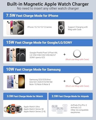 【5 in 1 Apple Magsafe Portable Charger】For wireless charging, the wireless powerbank can charge your iPhone, Apple Watch, and AirPods. For cable charging, it can charge 2 phones at the same time with two built in cables. Perfect MagSafe Battery Pack for iPhone 15/15 Plus/15 Pro/15 Pro Max/14/13/12, Samsung Galaxy S23 Ultra/S23+/S23/S22 and other qi Phones. Great iWatch charger for Apple Watch Ultra 2/Ultra/9/8/7/6/5/4/3/2/SE, Airpods Pro/3/2.