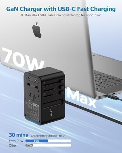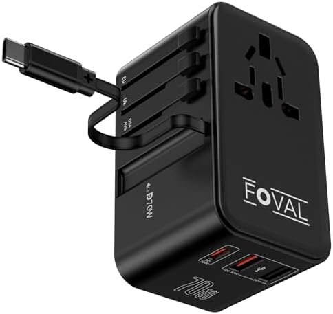 FOVAL 70W Universal Travel Adapter with Retractable USB C Cable, USB C &2 USB A …