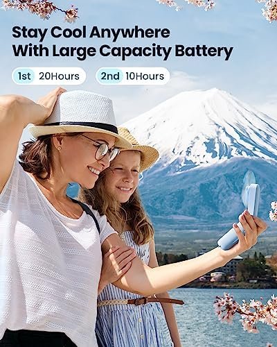 Powerful Airflow and Long Battery Life: The fan has 2 speeds which puts out quite a bit of airflow and a nice breeze; 2000mAh battery life lasts a long time, Fully charge 2.5 hours and run 14-21 hours; The blades are soft and safe