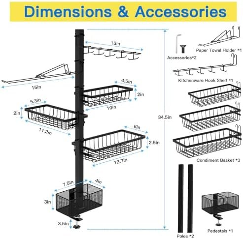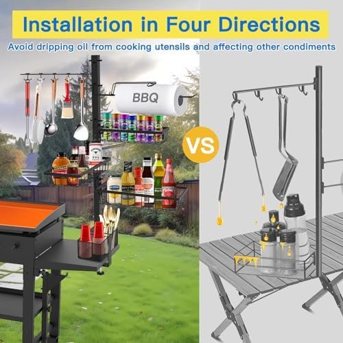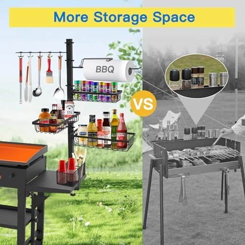 【High Quality & Large Capacity】: This blackstone griddle accessories adopts high-quality powder coating + high-quality steel material structure to ensure its durability. In addition to this, we have equipped the product with a total of three spice racks. With a 10-in-1 tool hook and paper towel holder, all barbecue supplies are organized and stored at once, so the countertop is no longer cluttered!