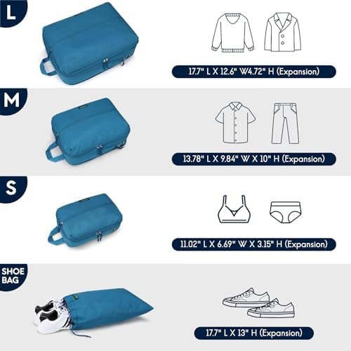 Large Storage: Haimont packing cubes let you easily and effectively organize and separate each type of clothing together. 4 in 1 design lets you fit them into any suitcase without taking up too much space. This 4 piece set features 2 expandable cubes for heavy items like jackets and sweaters but also have cubes for smaller lightweight items like shirts and undergarments. A small zipper bag can store toiletries. Drawstring bags are also included to keep dirty items away from clean
